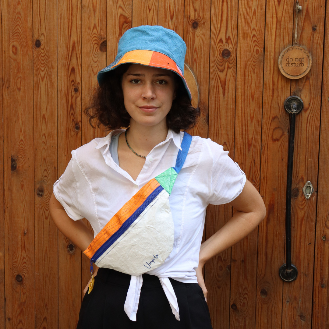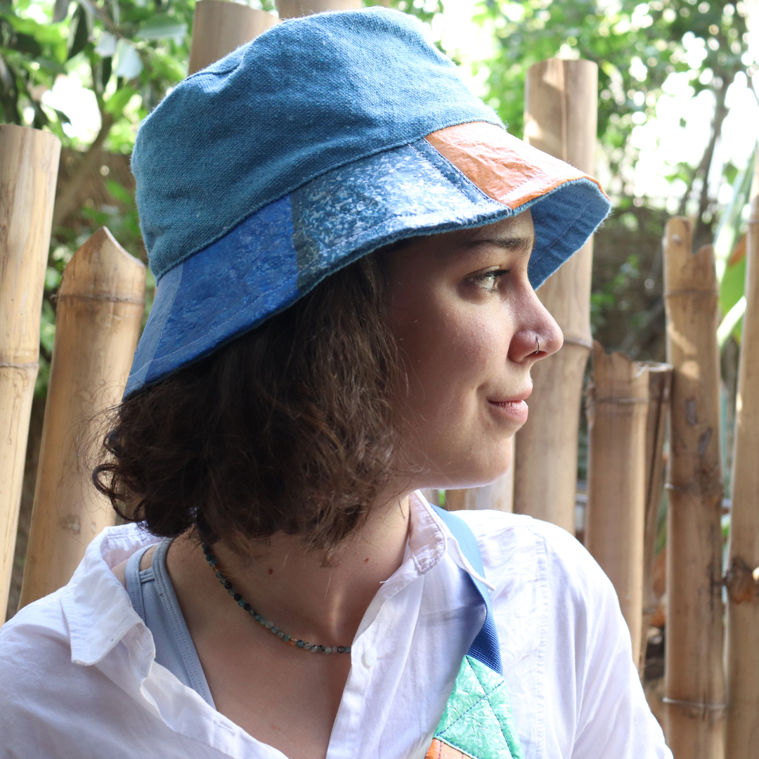 The colorful bucket hat that will keep your head protected from the heavy sun☀️ Colored up-cycled plastic bottom part with fabric lining and top.
